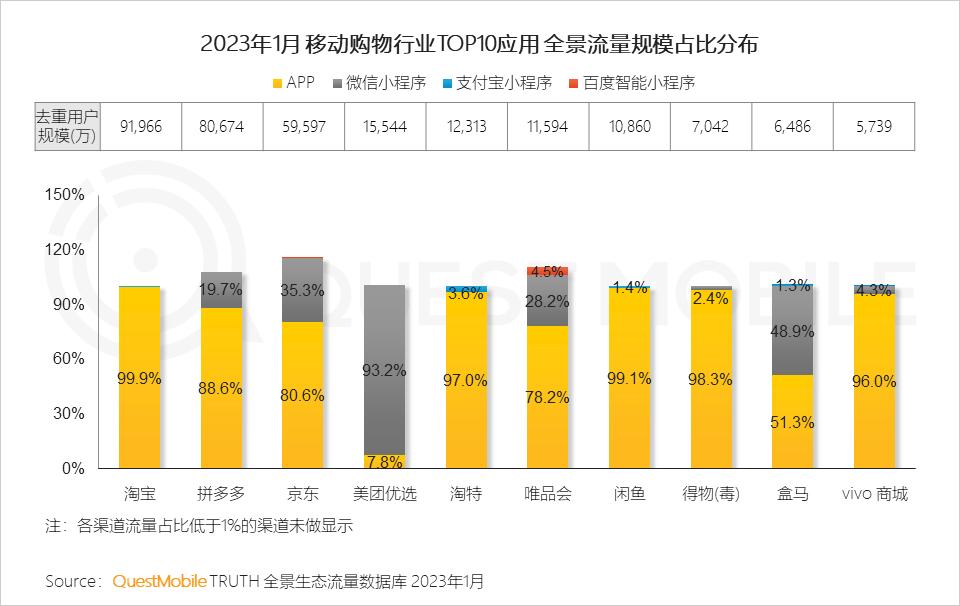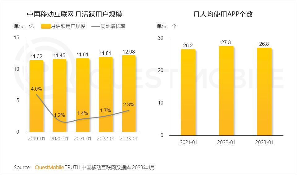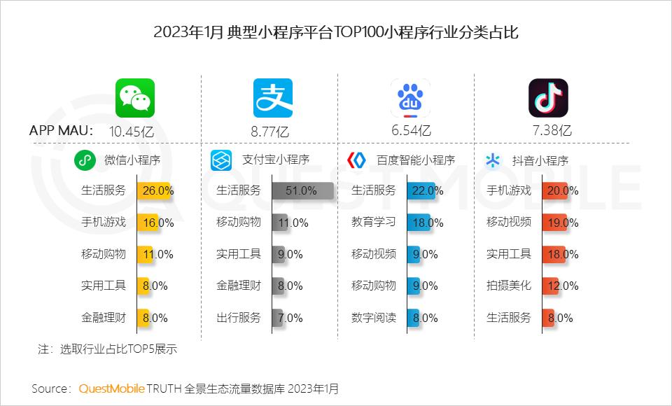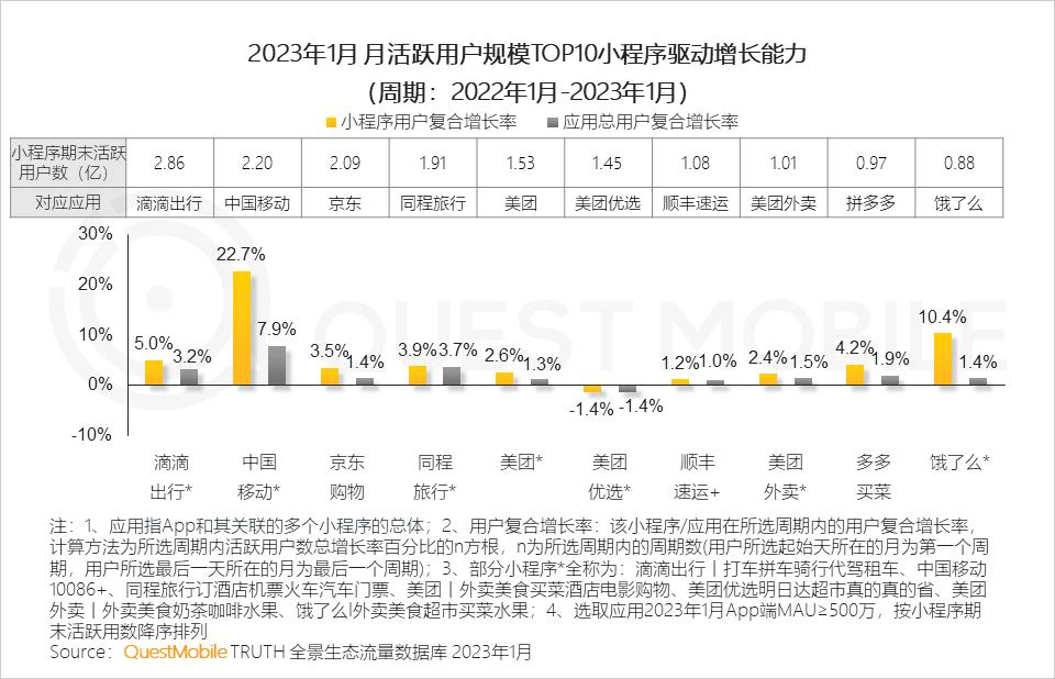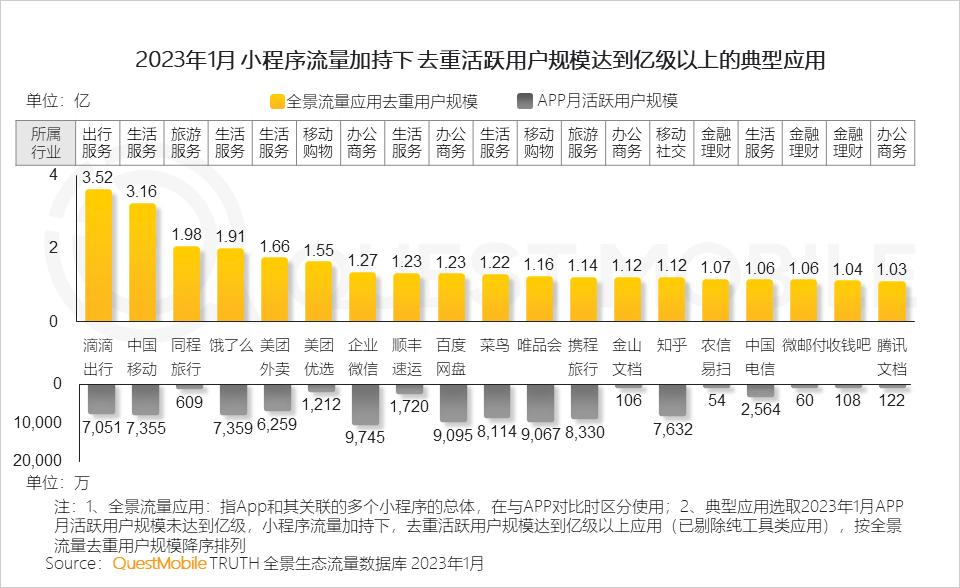 QuestMobile数据显示,2023年1月,19款应用在小程序流量加持下实现亿量级突破。