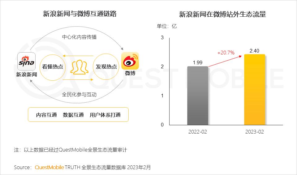 新浪新闻与微博通过内容、数据和账号体系的打通,实现更高效率的内容分发和传播,2023年2月,新浪新闻在微博站外生态流量已达2.40亿,同比提升20.7%。