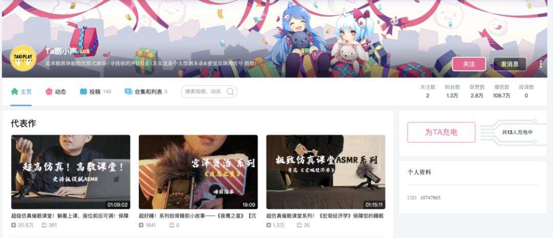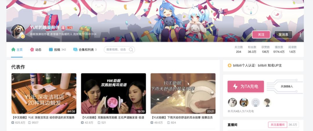 yue 的晚安陪伴在 B 站有超过 200 个助眠视频,并且每期视频的内容主题都不尽相同。风格相对舒缓,并且会带有一些轻声耳语和剧情,如果你想找一个「听得懂」的耳语音频,yue 的晚安陪伴或许能给你带来一些惊喜。