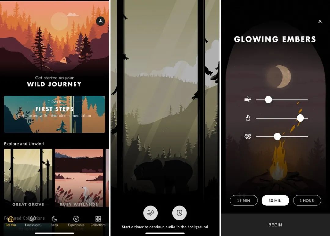Wild Journey 是一款设计精美的的白噪音应用,界面颇有《看火人》的感觉。在开启白噪音之后,整个屏幕只会显示插画,截图下来就是一张精美的壁纸。