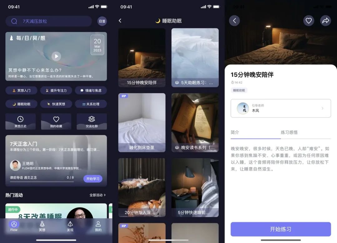 作为一款冥想应用,FLOW 中有丰富的课程可供练习。这些课程通常都按照难度与流程分为多个章节,通常需要学习了前置章节才能解锁后续章节。FLOW 中也有专注于「睡眠助眠」的板块,其中有许多不同的助眠音频。既有通过呼吸练习来帮助睡眠的入门课程,也有夜读陪伴,相信你可以在其中找到适合自己的冥想训练。