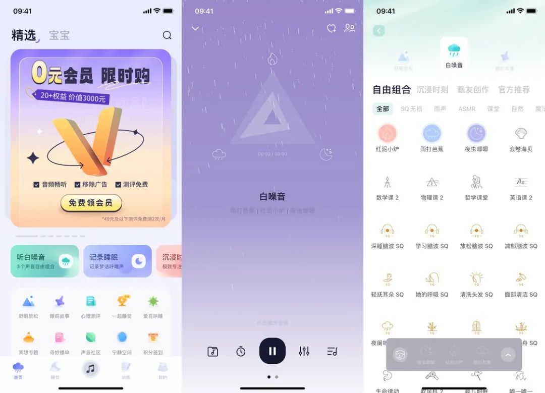 潮汐 18 元 / 月的订阅价则显得更加亲民,并且应用内的部分基础练习都是免费提供的,对于普通用户更加友好。如果你对冥想内容不感兴趣,只想在潮汐里收听白噪音的话,也可以选择 8 元 / 月的声音卡。