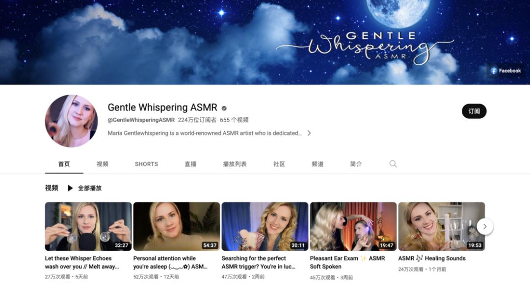 Gentle Whisper ASMR 是 YouTube 上 ASMR 视频的顶流之一,她的视频种类非常丰富,并且声音通常比较轻柔、舒缓,即便是第一次听 ASMR 的人也能很好地适应。