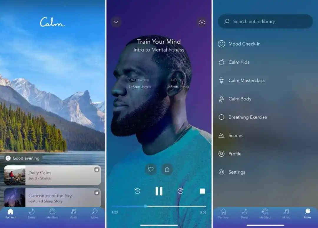Calm 最具特色的就是它的原创内容,开发团队不但在应用内制作了大量冥想练习,甚至还推出了一本名为《Calm: Calm the mind. Change the world.》的书籍来帮助用户培养平和的生活方式。在应用的「More」 分类下,你还能找到呼吸、白噪音等更多功能。