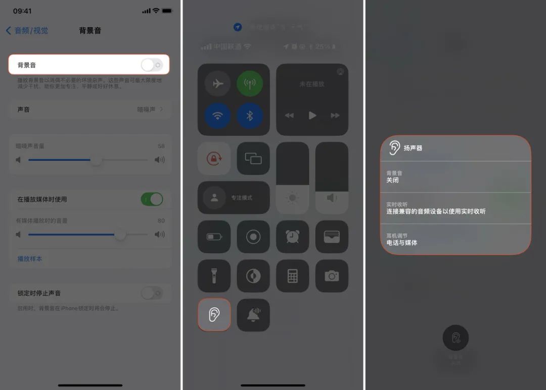 除了在辅助功能里开关外,你也可以在「设置 > 控制中心」添加「听觉」模块,并在控制中心里长按耳朵按钮,随后选择「背景音」来快速开启。