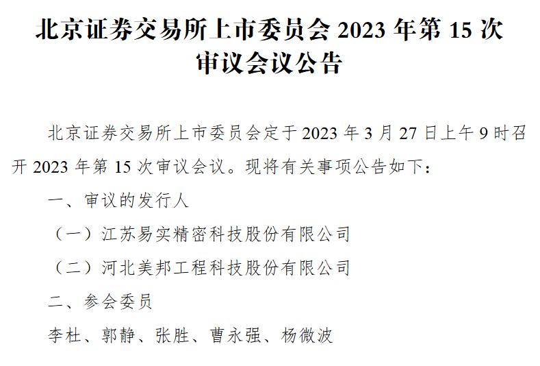 挖贝网 3月21日消息,北交所上市委将于3月27日召开2023年第15次审议会议,易实精密(836221)、美邦科技(832471)上会,参会委员为李杜、郭静、张胜、曹永强、杨微波。