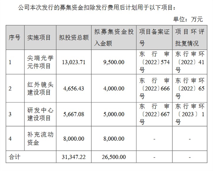 募集资金用途方面,公司本次发行的募集资金扣除发行费用后计划用于尖端光学元件制造建设项目、红外镜头建设项目、研发中心建设项目和补充流动资金,拟投入募集资金金额分别为9500万元、4000万元、5000万元、8000万元。