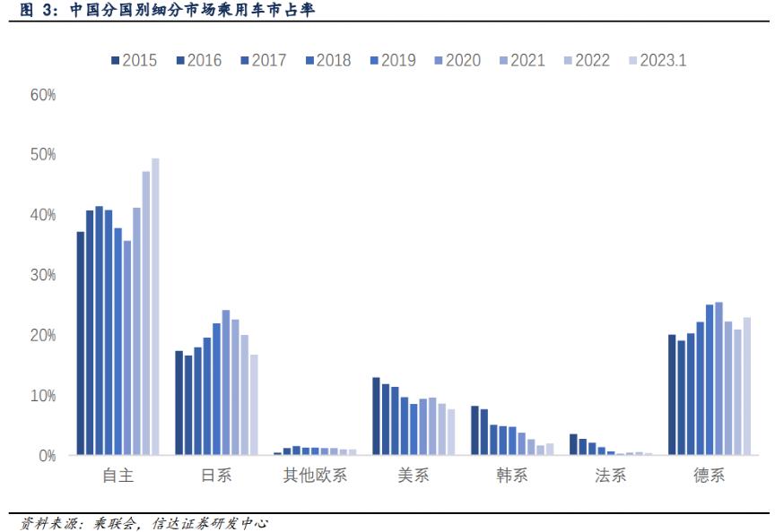 信达证券研报也显示,合资品牌库存天数显著上升。从整体库存来看,2023年2月全国乘用车库存为341万辆,整体库存天数为64天。从库存结构来看,2022年6月以来,合资品牌库存天数均高于自主品牌,反映了合资品牌竞争力下降的趋势。