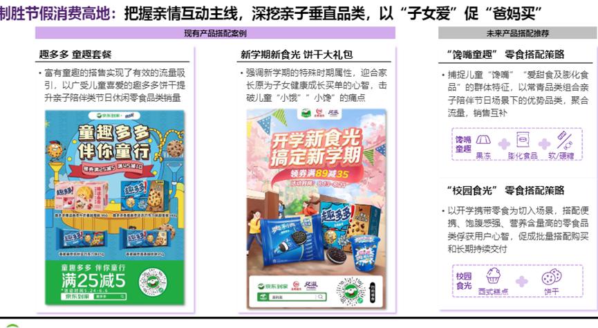 例如,儿童过生日需要零食+玩具,零食品类要丰富、具有趣味性;户外场景,零食更需要调小产品规格,便于书包携带;送礼(或与小朋友分享)场景,又需要大包装,满足同龄小朋友的社交需求。