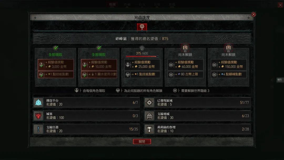 要知道,此前“暗黑破坏神”系列在练级环节是相当线性的。基本上是“奔主线—通关—提升难度—再奔主线”的流程,充其量加点副本,甚至只刷副本。其他的别说地图探索了,就连支线任务都没几个。如今仅仅在第一章,《暗黑破坏神4》就端出了一张内容如此充实的大地图。