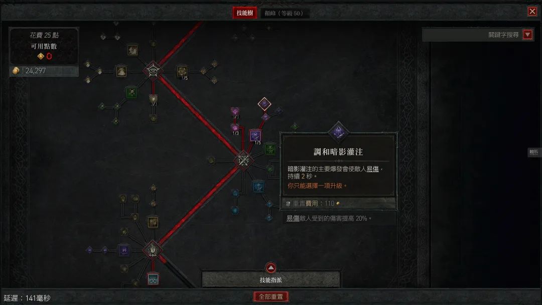 除了升级获得技能点外,玩家还可以通过地图探索等途径获取额外的技能点。不过,这个技能树倒也不像《暗黑破坏神2》那样每个技能都能点20级,因此完全不够用,现在绝大多数的主动技能等级上限都是5,获得某些属性或效果的被动技能的上限则是3,主动技能的附加效果则只有1级。再加上洗点比较方便,总体来说,这是一个相当清晰易懂、好规划的技能树。