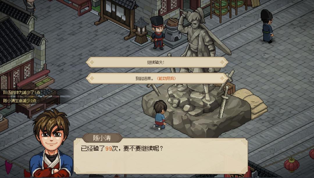 第三点是海量的细节支撑。我比较喜欢《大侠立志传》的一点,就是游戏内融入了很多很经典的RPG细节要素,从像素美术 (人物立绘和局内人物动作的完成度都特别高) ,到小型事件 (比如对着英雄雕像磕头100次震掉了雕像的石剑) ,到梗 (名台词、新老黑话、经典桥段俱全) ,再到各式各样的交互动效、大量结局CG。