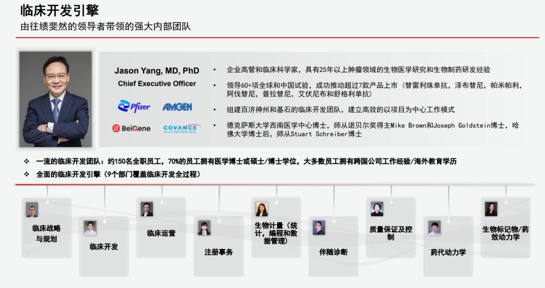 另一方面,公司搭建起9个部门,全面覆盖临床开发全过程。每个部门均由公司高管、临床科学家等专家把控,从临床战略规划开始,到临床开发、质量保证及控制、药效动力学等各个环节,均通过精而专的方式做到极致,保证效率和效果的最大化。