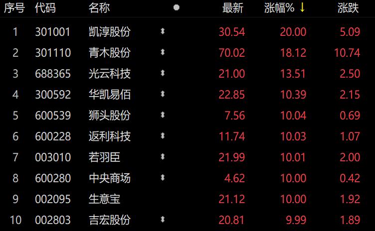 截至今日收盘,凯淳股份20CM涨停,青木股份涨18.12%,光云科技、华凯易佰涨超10%,狮头股份、返利科技、若羽臣、中央商场、生意宝、吉宏股份涨停。