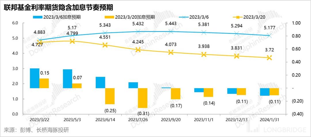 3)海豚君认为除非银行信任危机失控性蔓延,不然很可能的路径是:注入流动性+加息放缓(再加25个基点,基础利率在4.78%左右)但在高息位置上仍会仍维持一段时间,让就业市场矛盾明显缓和下来,而非市场目前预期得到今年6月份直接进入降息状态,因此,可能要警惕后续收益率回升带来的股市回调风险。