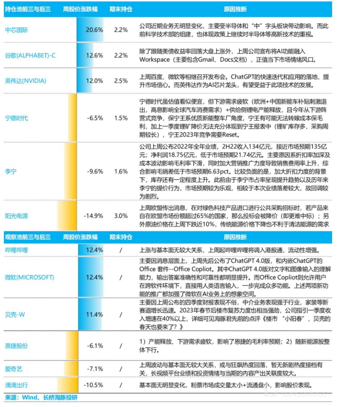 涨幅比较明显的公司,主要是美债收益率下行之下,科技与半导体涨幅明显,尤其是国内的中芯国际、海外的英伟达,以及美股的谷歌等等,不仅又收益率下行,还有ChatGPT短期无法证伪的故事支撑。