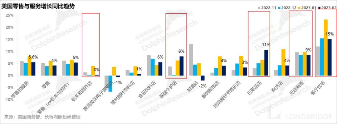 不过,好在2月零售增速再次回落到了5-6%的区间,增长了5.6%,单月零售额6114亿美金,分项来看,美国同样民以食为天,餐饮这种社服性零售额在大体量之上,仍在高增长;日用品从占比上来看,属疫情后的修复性增长,而以电商为主的无店商贩增速同样明显跑超大盘。