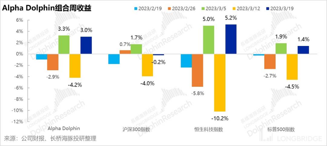 在 3月 17日周内,Alpha Dolphin 组合上行3%,涨幅明显超过标普 500(+1.4%)以及沪深300(-0.2%),但低于恒生科技5.2%。