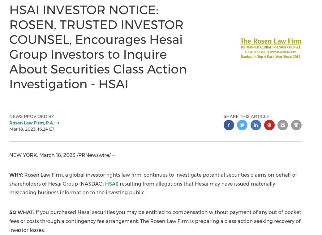 禾赛科技股价跌跌不休的同时,又被美国专注于证券集体诉讼的律所The Rosen Law Firm盯上了,该律所在3月18日发出了一个针对禾赛科技3月16日发布的2022年Q4和2022年全年的财报集体诉讼调查须知,该须知旨在鼓励禾赛的投资者通过the Rosen Law Firm发起集体诉讼,原因是上述的财报是重大误导性是商业信息,从而导致投资者损失。