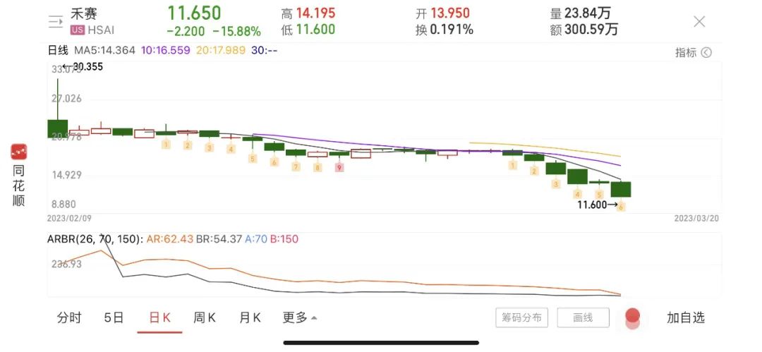 北京时间3月21日凌晨,作为首家在美股上市的中国激光雷达公司,禾赛科技(HSAI)继续大跌15.88%,收盘价11.65创下新低,最近六个交易日跌幅接近40%,上市以来市值从最高点跌去了60%,相比发行价的19美元也跌去了将近40%。