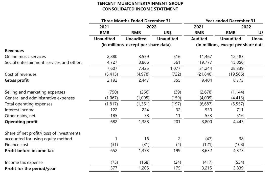 3月21日下午,腾讯音乐发布2022年第四季度及全年财报。财报显示,腾讯音乐2022年第四季度营收74.3亿元,净利润11.5亿元,同比增长114.7%。调整后净利润14.4亿元,同比增长72.8%。