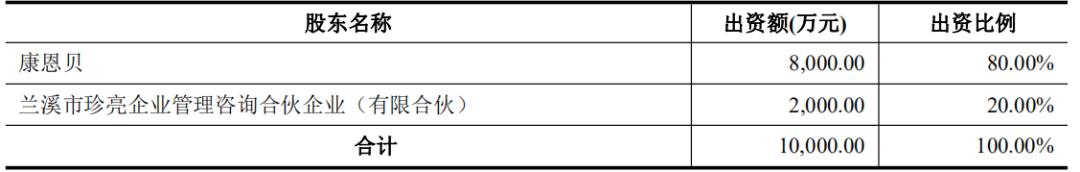 2018年7月,根据公司股东会决议,江西天施康将其持有公司的81.25%股权转让给康恩贝,上述股权变更后,珍视明成为康恩贝的全资子公司。同年11月,新股东兰溪市珍亮企业管理咨询合伙企业(有限合伙)增加注册资本2,000万元,股权结构如下: