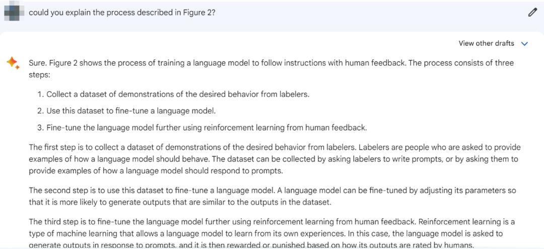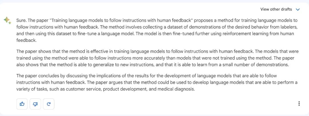 上星期,GPT-4 展示了多模态的识图能力,其中就有总结 InstructGPT 论文的展示,在这里 Bard 还不能识图,不过它可以搜到 InstructGPT 并评价一番: