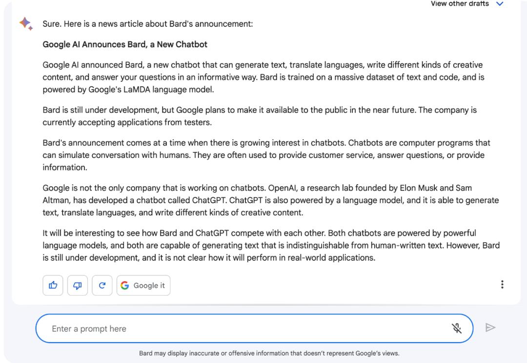 最后,我们也尝试了让 Bard 生成一篇「发布 Bard」的报道,它自己写了篇新闻,看起来也令人满意。
