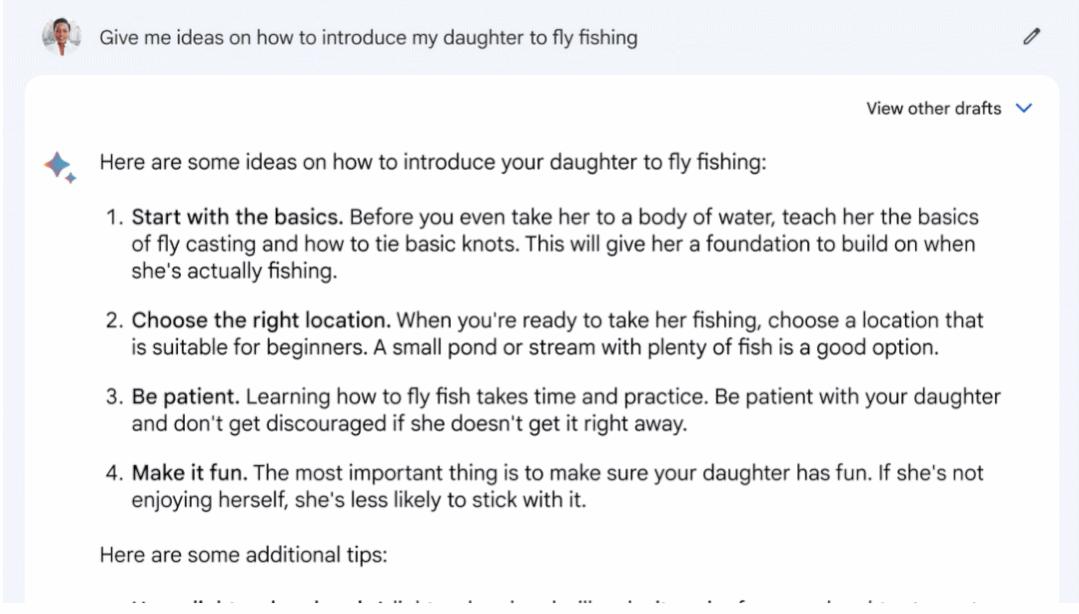 比如,Bard 可以解释大语言模型为什么会出错、闪电为什么两次击中同一个地方,可以帮助你着手写自己的第一篇小说、为你的周末钓鱼和露营准备装箱单,可以帮你完成艺术工作室的标语、概述你的关于夏季无酒精鸡尾酒配方的博客,并建议在你的纯素食谱中添加高蛋白质食物,等等。