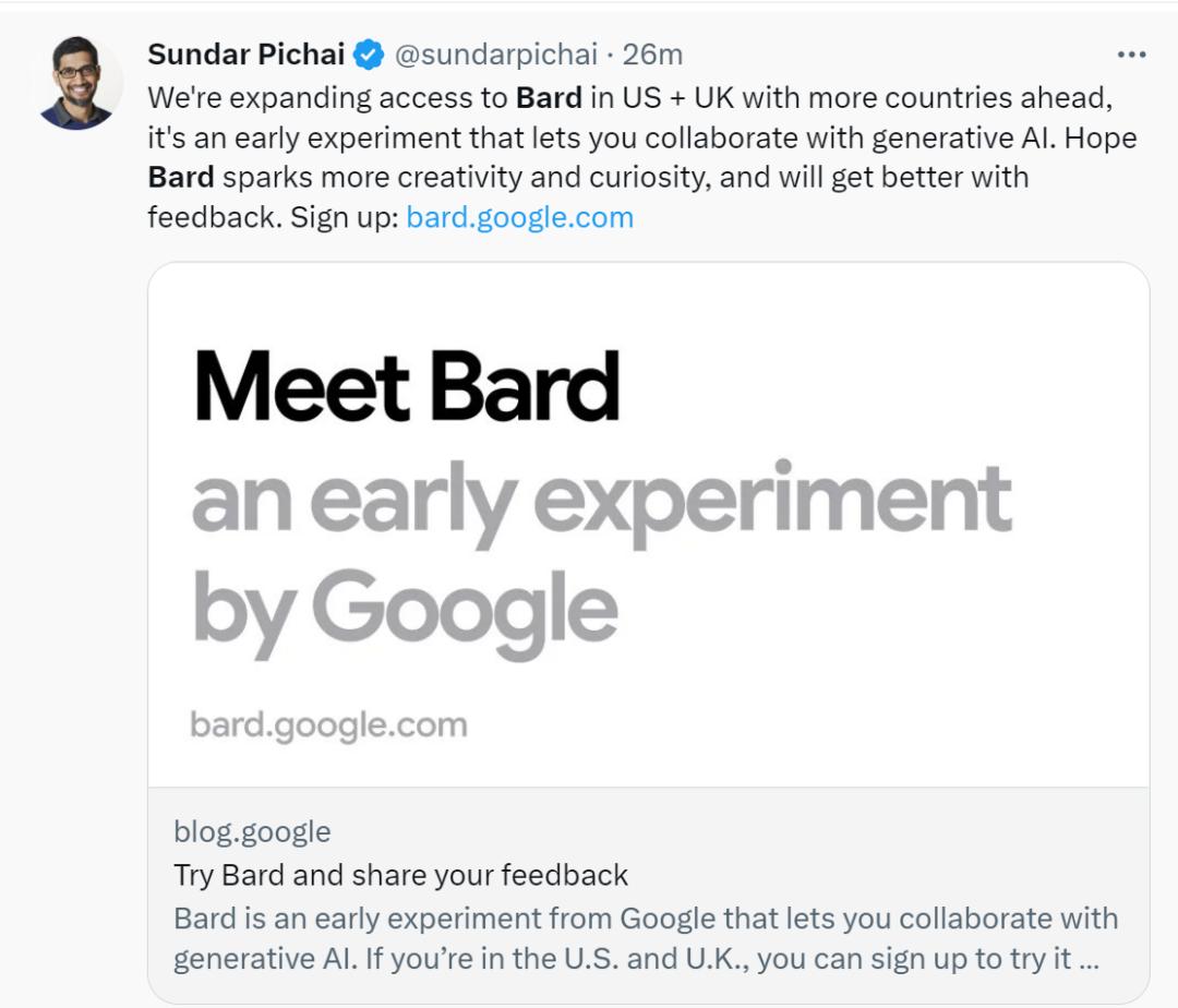 据谷歌 CEO 桑达尔·皮查伊的推特,此次开放使用将首先从美国和英国的用户开始 —— 用户可以申请加入 Bard 的候补名单(waitlist)。