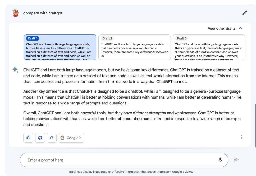Bard 能在瞬间生成文本块,这与 ChatGPT 逐字输出答案的方式不同。此外,Bard 还有一个优势,其给出的答案包含三个不同的版本或草稿,用户可以切换其中任何一个答案。