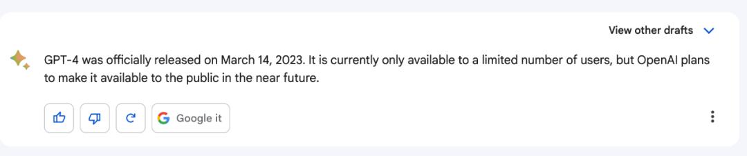 从对话中,Bard 透露出它是实时联网。我们也测试了下,它竟然知道 GPT-4 发布时间是 3 月 14 日。