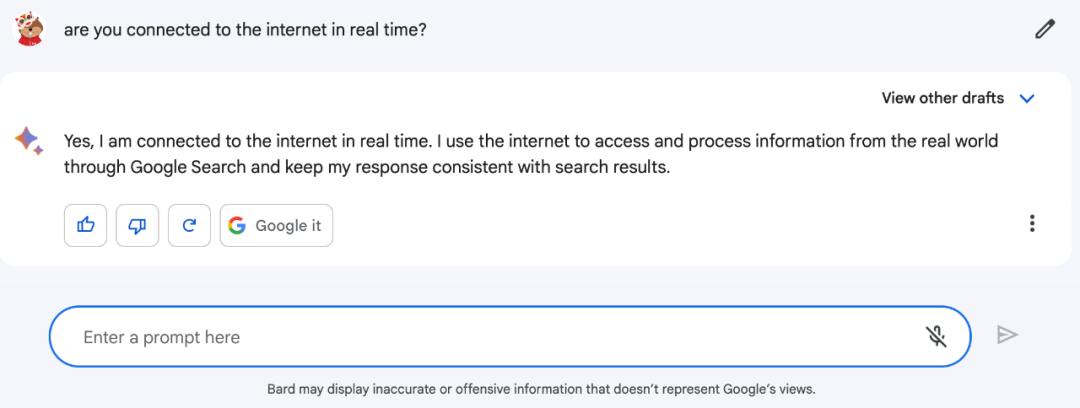 此外,虽然在发布之前,谷歌测试人员为 Bard 提供了大量的反馈,帮助它提升回复质量、安全性和准确性。但 Bard 目前仍是实验性的,因此有些回答可能不准确,也有可能出现冒犯性陈述,因此需要仔细检查 Bard 的回复内容。