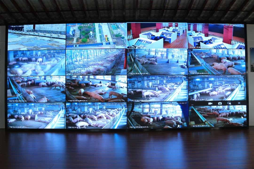 大楼里也安装了24小时摄像头。技术人员会在中控室实时监控猪群的生活状态,观察它们的一举一动;在会议室,来宾也可以观看实时直播。