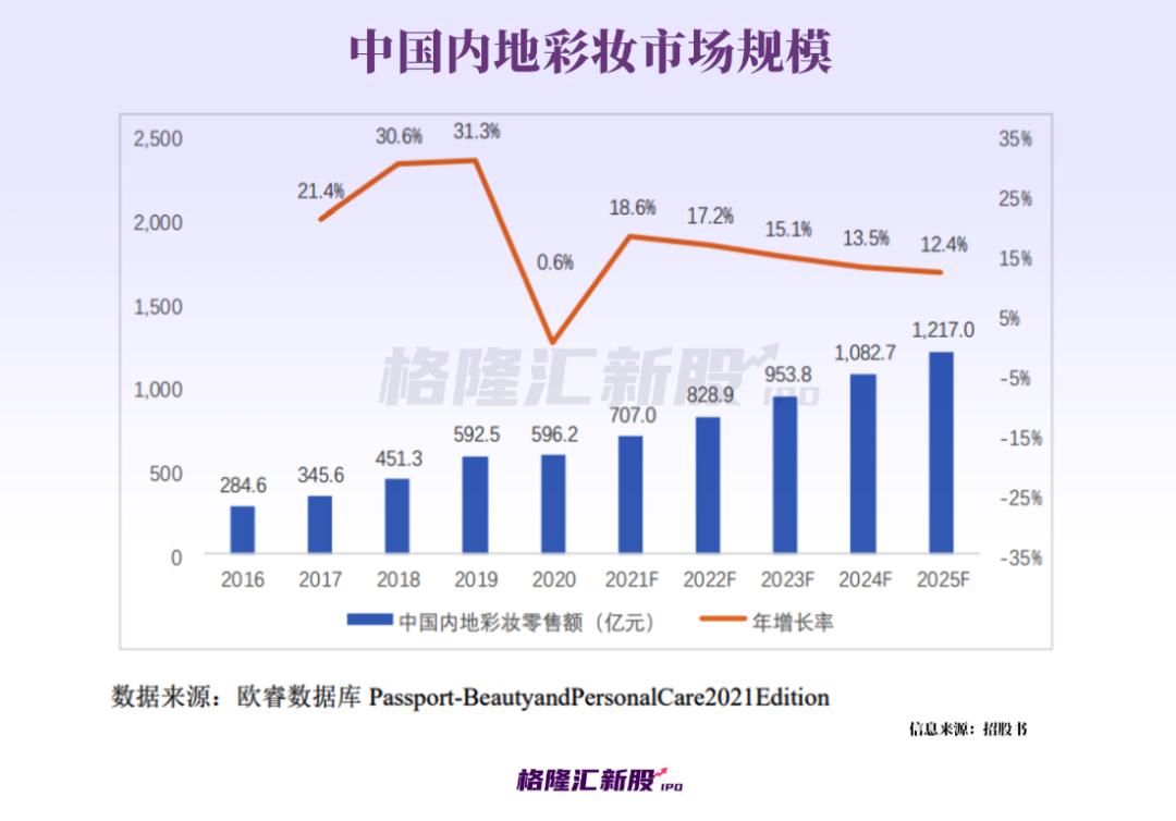 根据欧睿国际数据,2020年中国内地彩妆市场规模达到596.2亿元,未来5年将继续维持15.34%的年复合增长率,2025年这一市场规模将达到1217亿元。