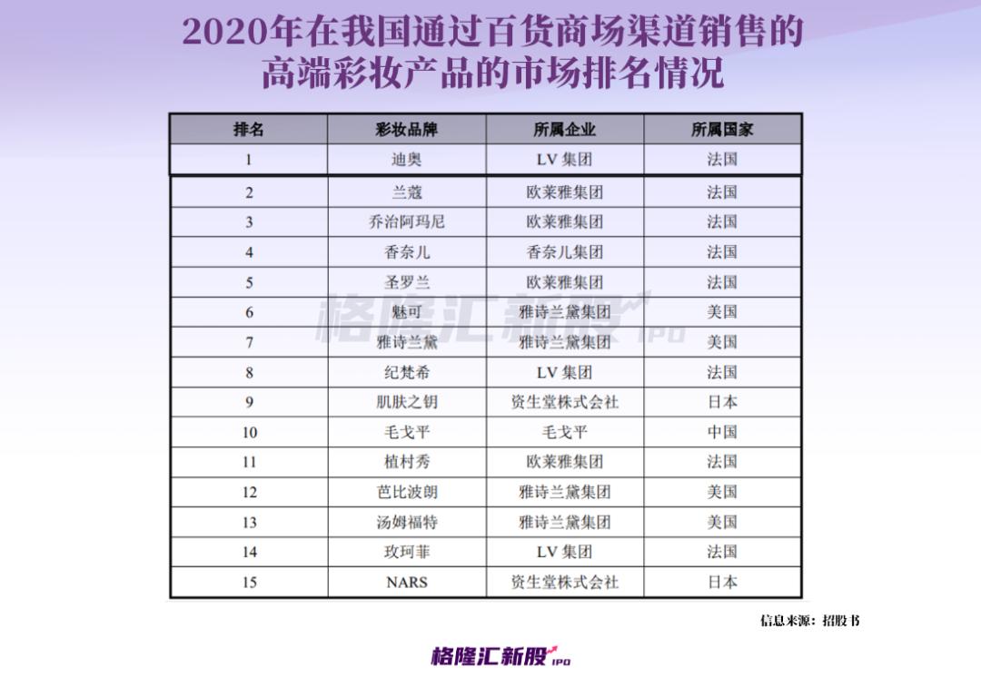 根据欧睿国际的数据,2020年毛戈平品牌在我国通过百货商场渠道销售的高端彩妆产品的市场排名第十位。