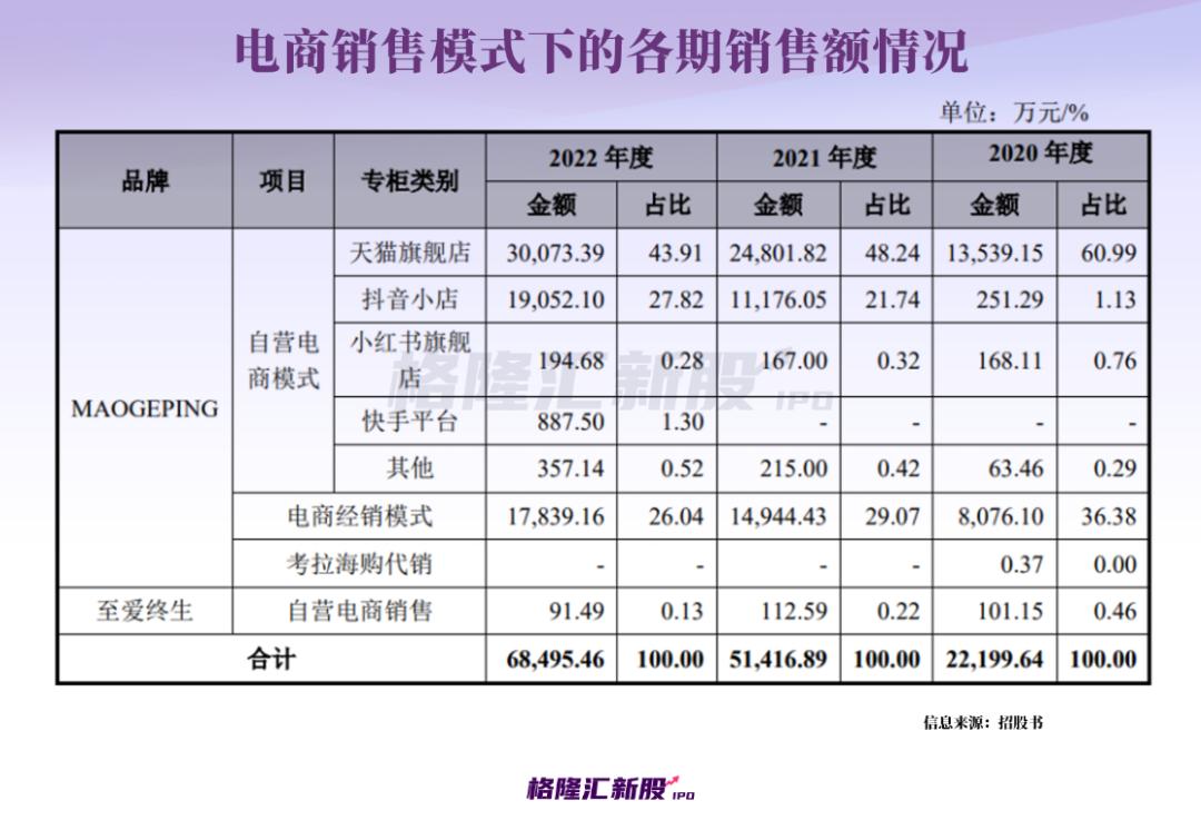 根据招股书,公司MAOGEPING品牌目前已经拥有275万会员,风尚系列会员复购率均达到80%以上;在电商渠道,公司MAOGEPING品牌天猫旗舰店、MAOGEPING品牌抖音小店等平台连续创造新高,目前天猫旗舰店拥有粉丝数量440万,抖音平台拥有粉丝数量140万。