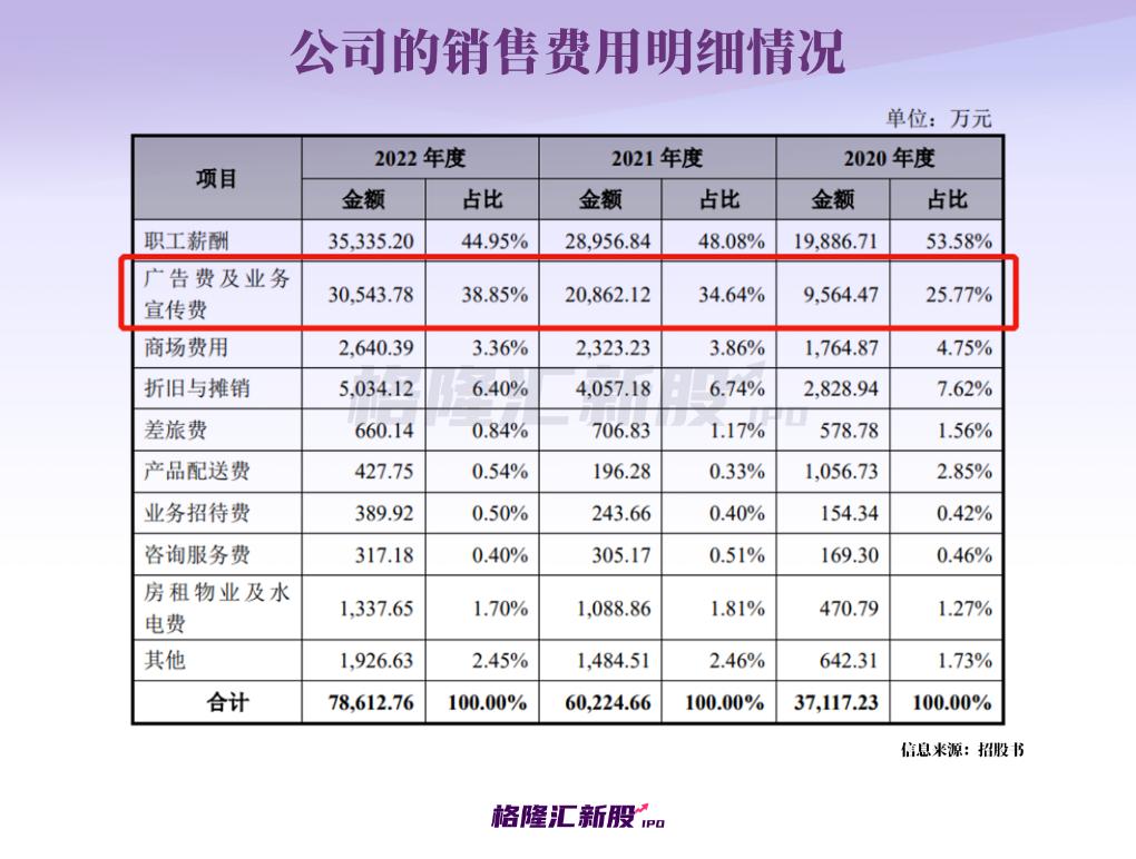 与之相对,公司的销售费用占营业收入的比例分别为42.09%、42.07%、46.74%,总体呈上升趋势,主要原因是随着业务规模的扩大,公司销售人员薪酬、广告费及业务宣传费金额快速上涨。其中,报告期各期,公司广告费及业务宣传费的金额从2020年的9564.47万元增至2022年的3.05亿元。