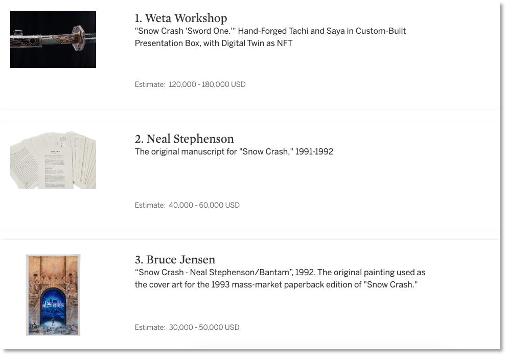 事实上,自从元宇宙概念火了之后,斯蒂芬森有意强化他“元宇宙”之父的人设,并借助《雪崩》的影响力进行商业变现。3月初,斯蒂芬森联合苏富比拍卖行举办了一次拍卖会,拍品包含《雪崩》的原稿、原始排版手稿、出版时的封面、小说原画中的皮夹克等等,每件拍品的价格从6000美元到18万美元不等。去年10月,他还在社交媒体上公布了《雪崩》新豪华精装版图书,为这本“重装书”的发售预热。