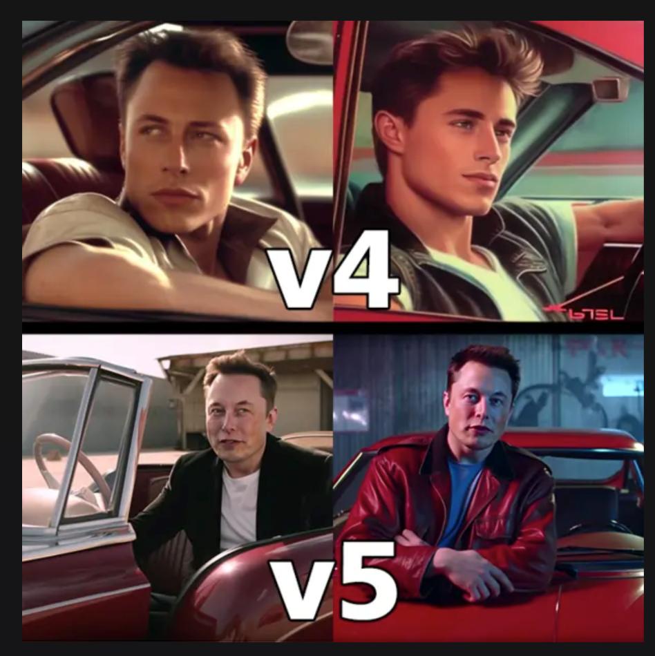 下图是以“埃隆·马斯克介绍特斯拉,90 年代的商业广告”为 prompt(提示),分别用 Midjourney V4 和 Midjourney V5 生成的图像。