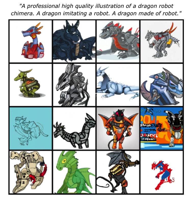 DALL·E 还可以将其单独学习但从未在单个生成的图像中看到的概念组合在一起。例如,在训练集中有机器人和龙的插图,没有龙形机器人。当被提示 “机器人龙” 时,模型仍可以产生对应的图像。