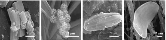 亚洲沙尘颗粒上的吸附物。从左至右:人类活动产生的硫化物晶体,花粉,未知有机物,未知有机物。