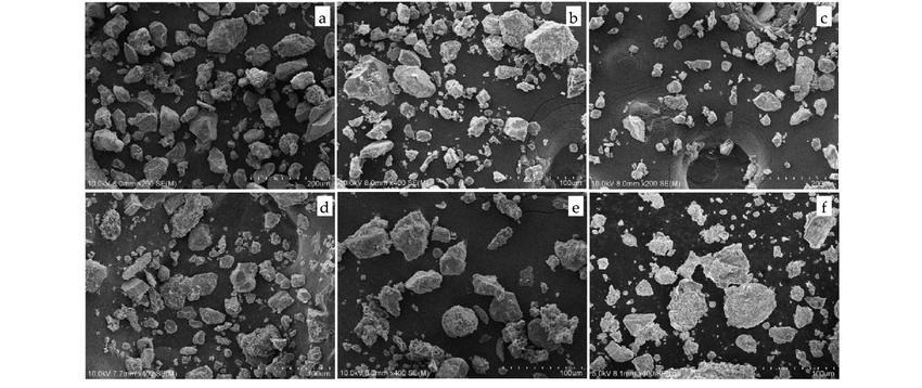 扫描电子显微镜下的沙尘颗粒 (a) 沙坡头; (b) 靖边; (c) 兰州; (d) 北京; (e) 石家庄 (f) 济南|参考文献[1]