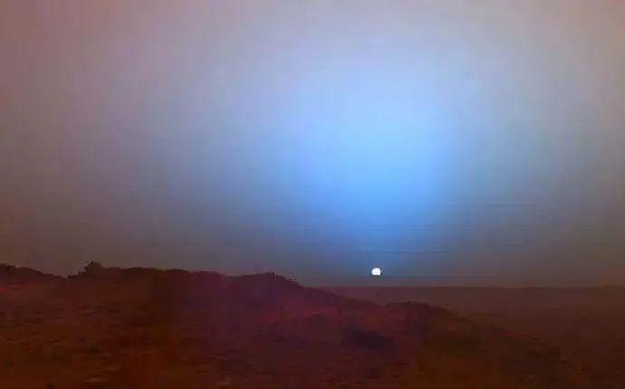火星大气中尘埃颗粒等物质也比较多,所以火星上的太阳也是蓝色的。下图是好奇号火星车在火星上拍摄的日落。