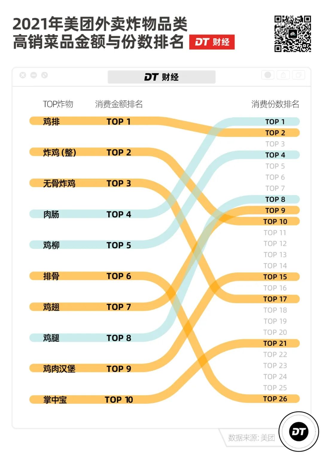 美团数据显示,2021年大众点评用户评价中,排名前三的高频词汇就是好吃、性价比和实惠。2021年,炸物小吃以超过6.5亿单的单量,成为小吃第一大品类,其中又以鸡排为首。
