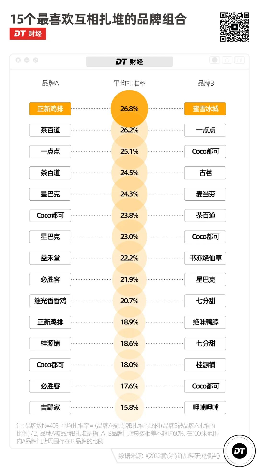 这不是凭空观察得出来的结论。 《2022餐饮特许加盟研究报告》显示,在各个餐饮品牌中,扎堆率最高(29.9%)的组合为正新鸡排对蜜雪冰城的扎堆,也就是说,大概平均每3家蜜雪冰城,就有1家旁边开着正新鸡排。