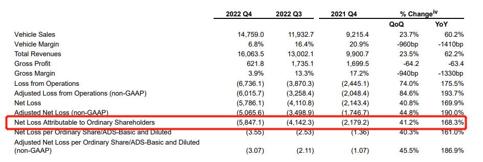 从营收和销量来看,蔚来都达到了历史新高,与此同时,亏损也达到历史新高。2022年第四季度蔚来亏损58.7亿元,同比亏损169.9%,环比亏损40.8%;全年来看,净亏损达到144.37亿元,较去年同期亏损扩大259.4%。