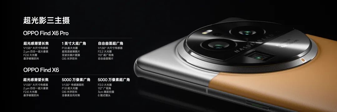 比如长焦摄像头采用了1/1.56英寸大底传感器,四合一后2μm的超大像素尺寸,同时搭配了F2.6大光圈的潜望式光学模组,让手机长焦摄像头在暗光下的成像能力实现质的飞跃。广角摄像头搭配了超高透玻璃镜片、F1.8的超大光圈以及 OIS光学防抖,让OPPO Find X6 Pro 拥有目前进光量最大的广角摄像头。超广角摄像头采用业界超广角最大的1/1.56英寸的传感器搭配自由曲面镜片与F2.2大光圈,最大限度地解决畸变问题,让Find X6系列能够提供目前强大的超广角拍摄能力。