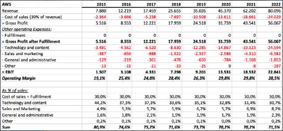 AWS的履行成本应该为零。将假设销售管理、一般和管理和其他成本等于AWS在合并收入中所占份额的%。剩余的运营成本(这是运营成本中最大的一部分)应该由技术和内容成本组成。