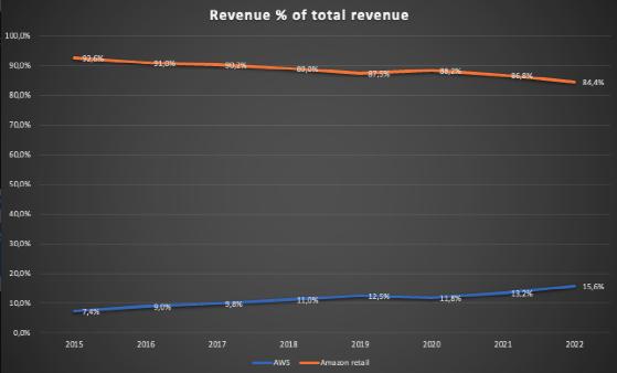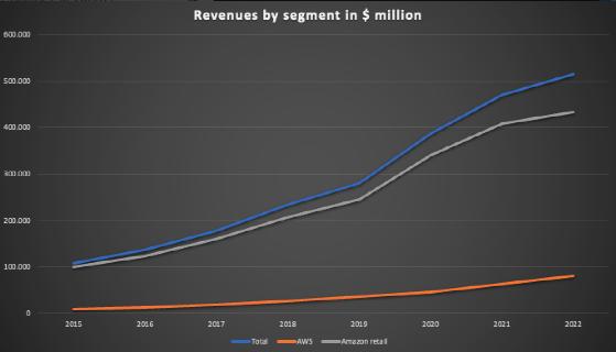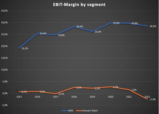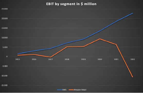 可以看到,前面提到的亚马逊零售部门盈利能力增长的假设直到2020年都是正确的。2021年的息税前利润略有下降,然后在2022年转为严重负值。另一方面,正如预期的那样,AWS表现不错。